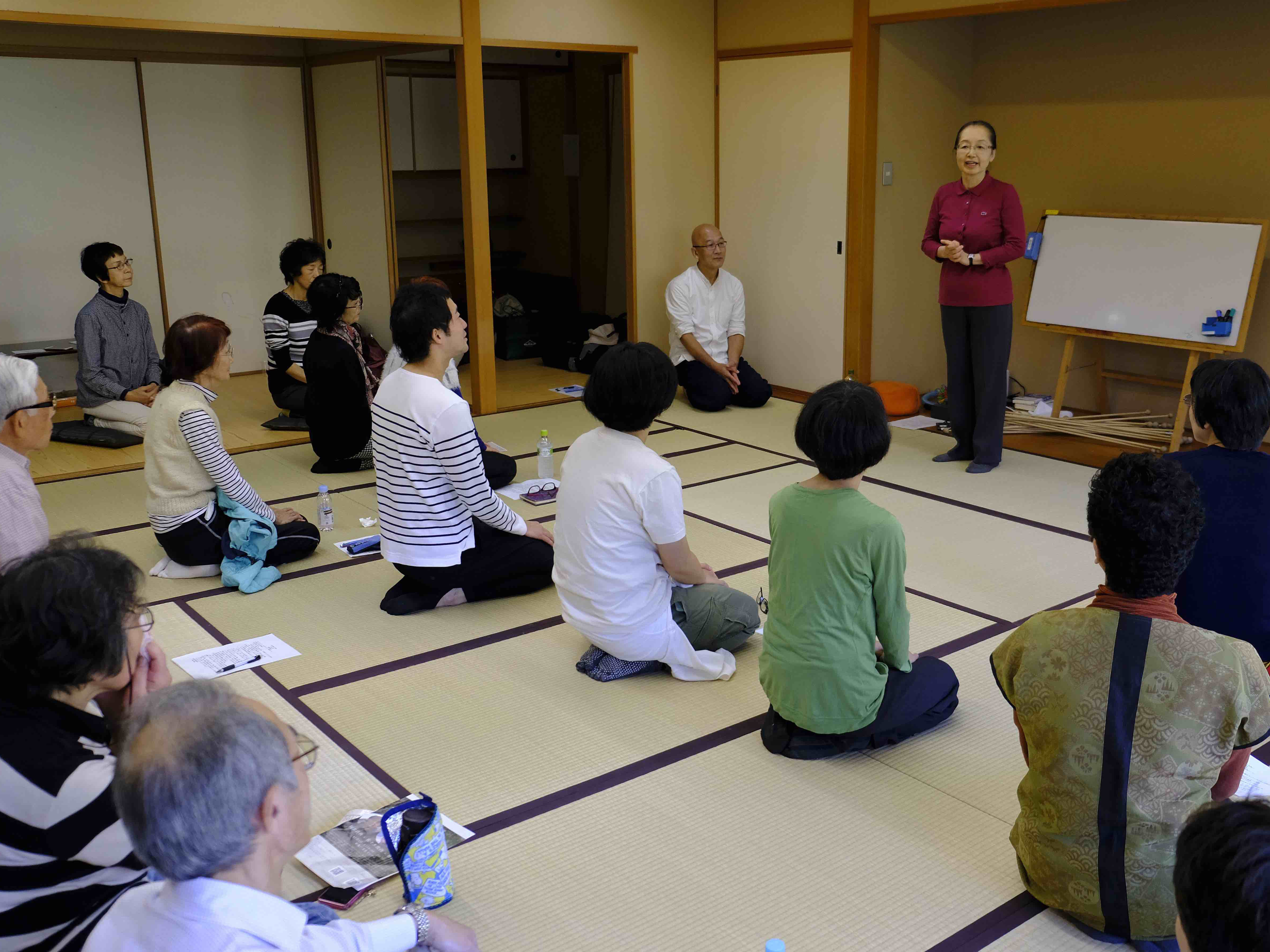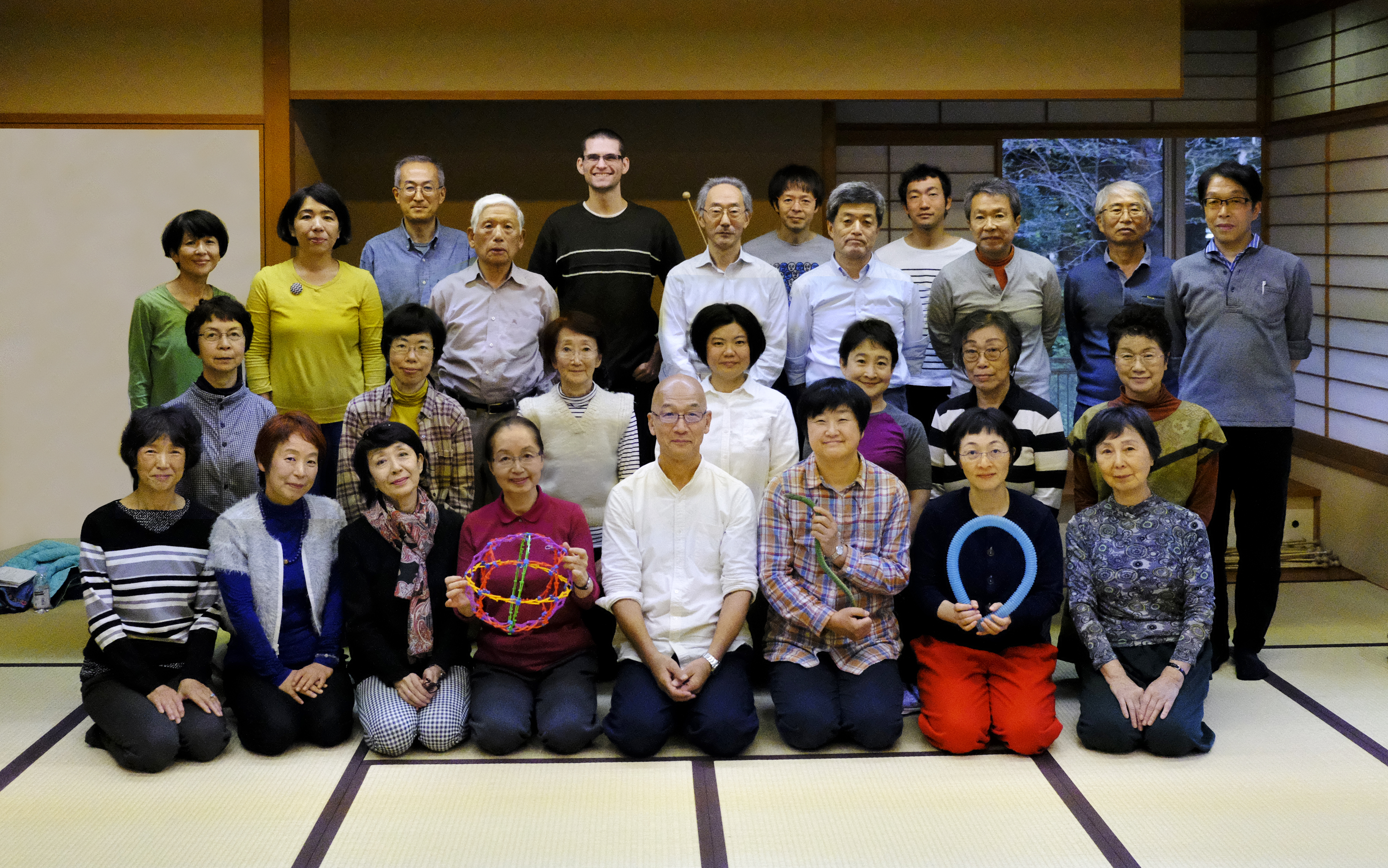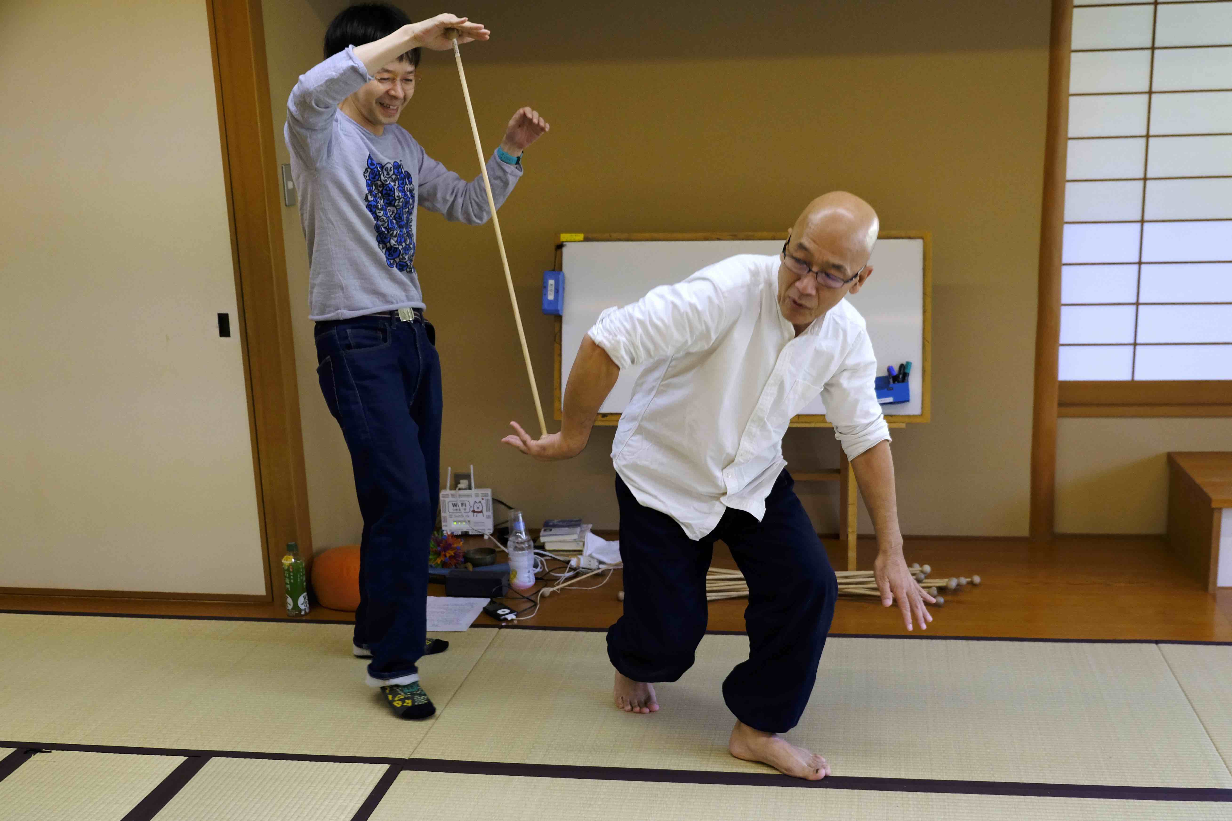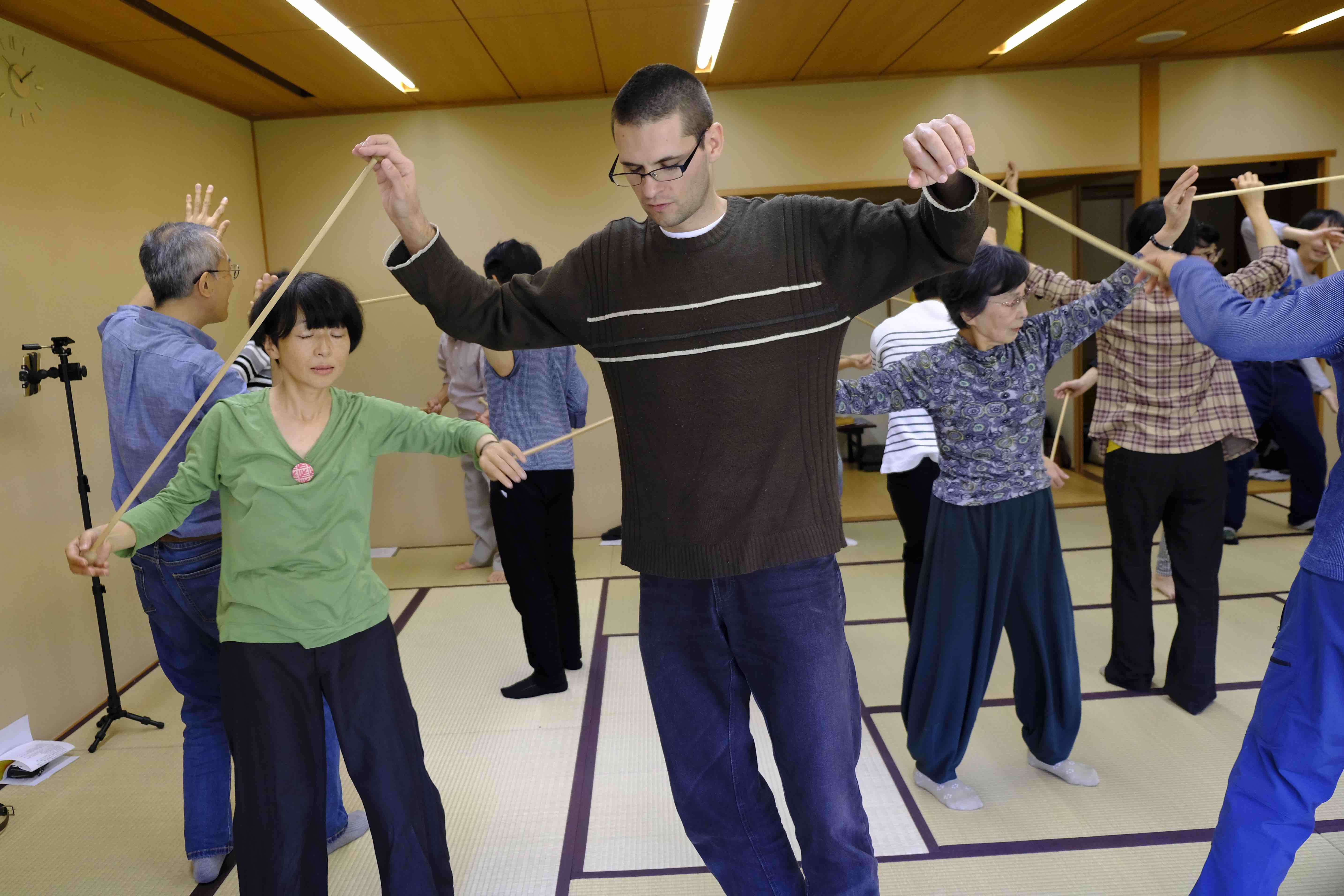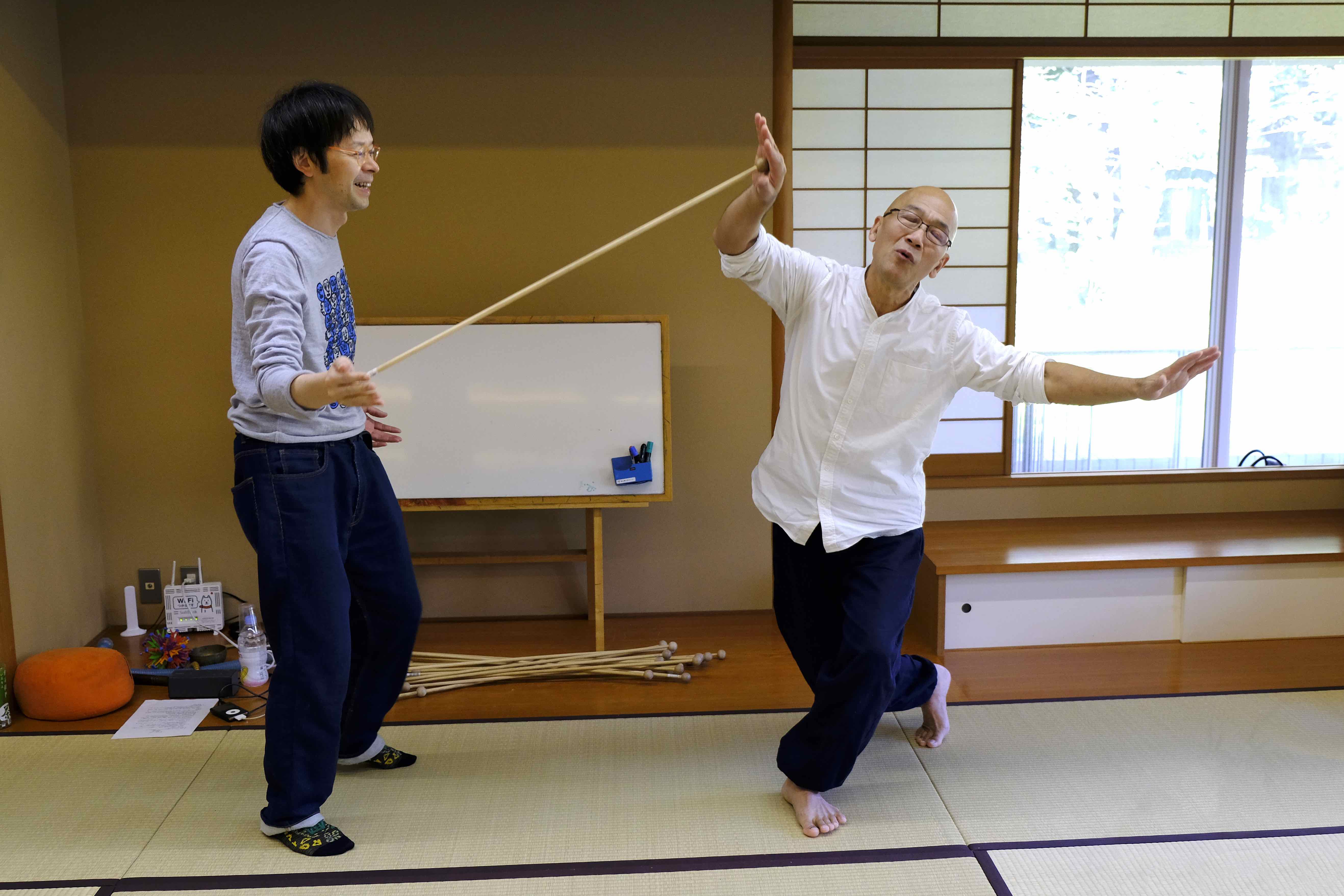 ↓ アイスブレイク(つながりのワーク)では、参加者が”如意棒で”繋がり会う。